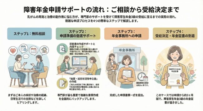 乳がんの再発により、抗がん剤治療による副作用に悩まされているなか障害年金の申請を行い、障害厚生年金3級に認定されたケース