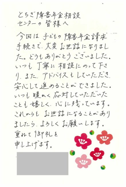 お客様からのお手紙250 宇都宮市H様の障害年金